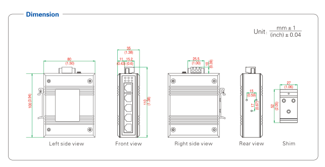 RJ45 ports: 5 10/100Base-T (X) ports, auto-detection, full/half duplex, auto MDI/MDI-X